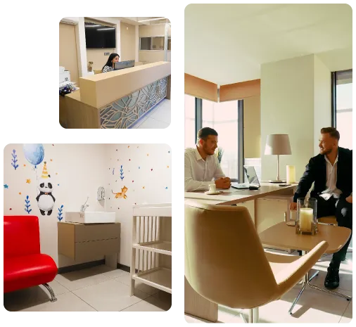 Lavabo, tuvalet, mobilya, çalışma masası, misafir kanepesi ve koltukları, sehpalar, IP telefon, muayene masası, 27" monitör gibi seçeneklere sahip konforlu muayenehaneler.