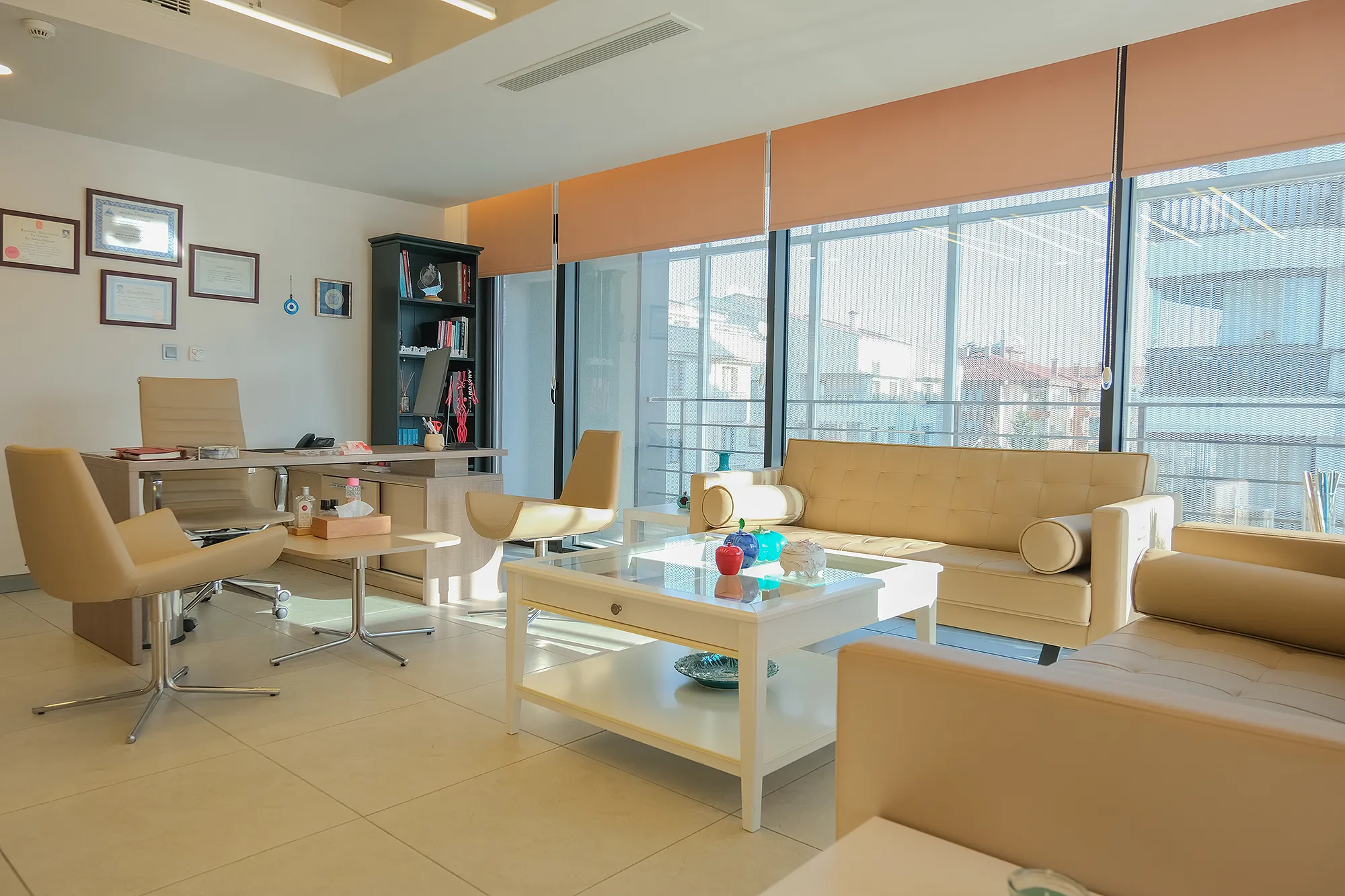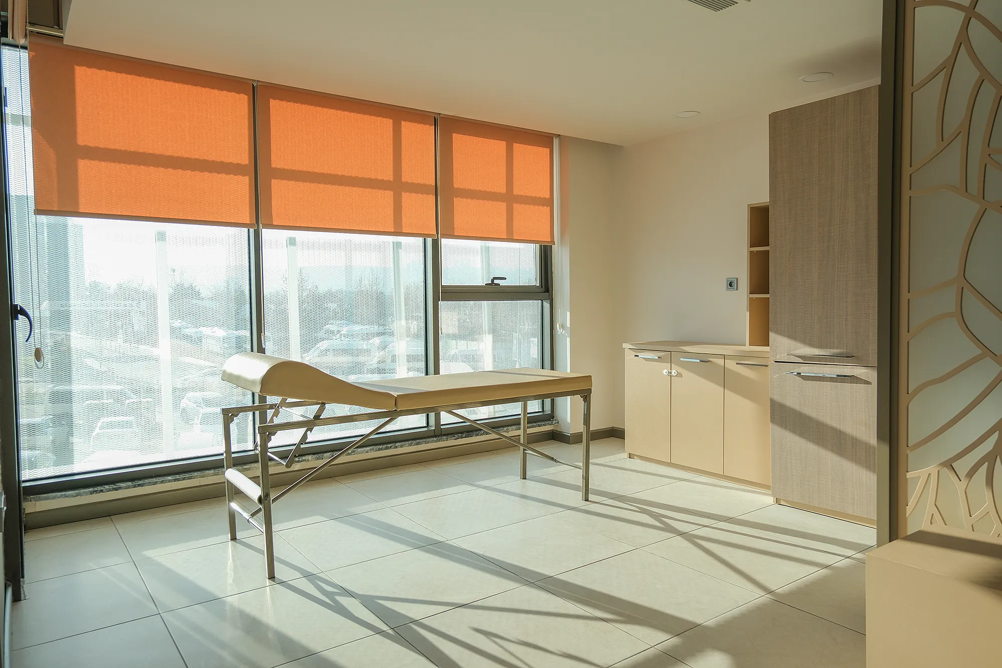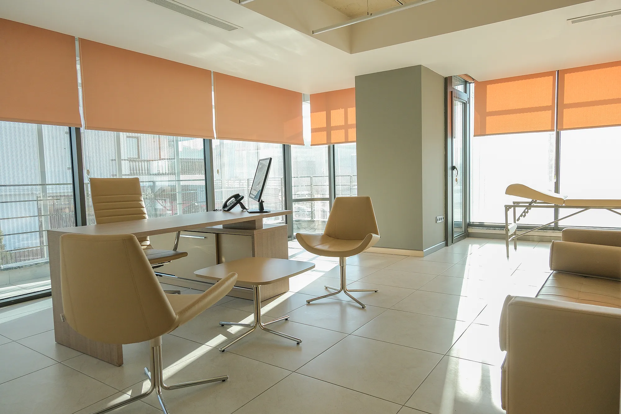Lavabo, tuvalet, mobilya, çalışma masası, misafir kanepesi ve koltukları, sehpalar, IP telefon, muayene masası, 27" monitör gibi seçeneklere sahip konforlu muayenehaneler.