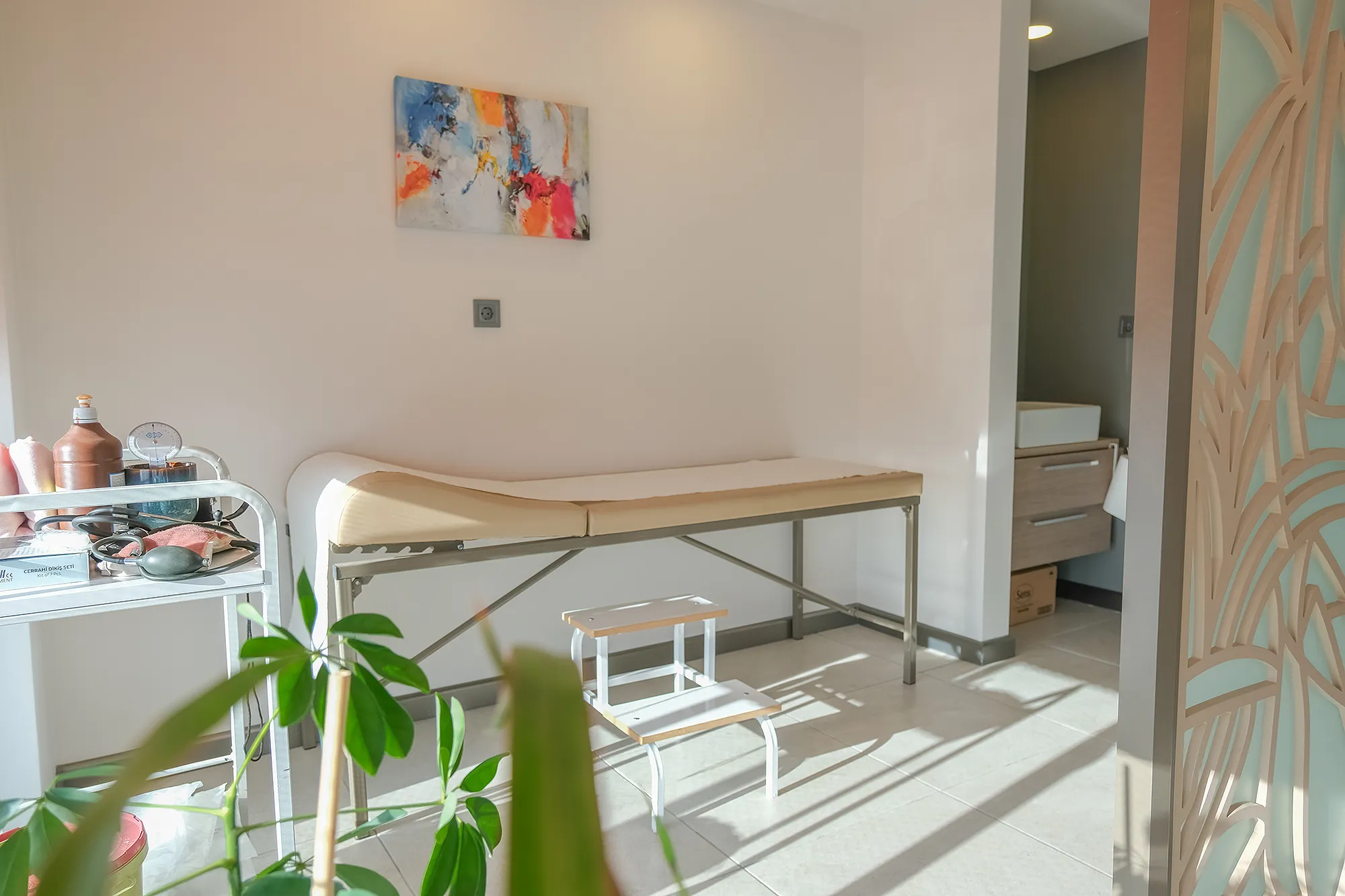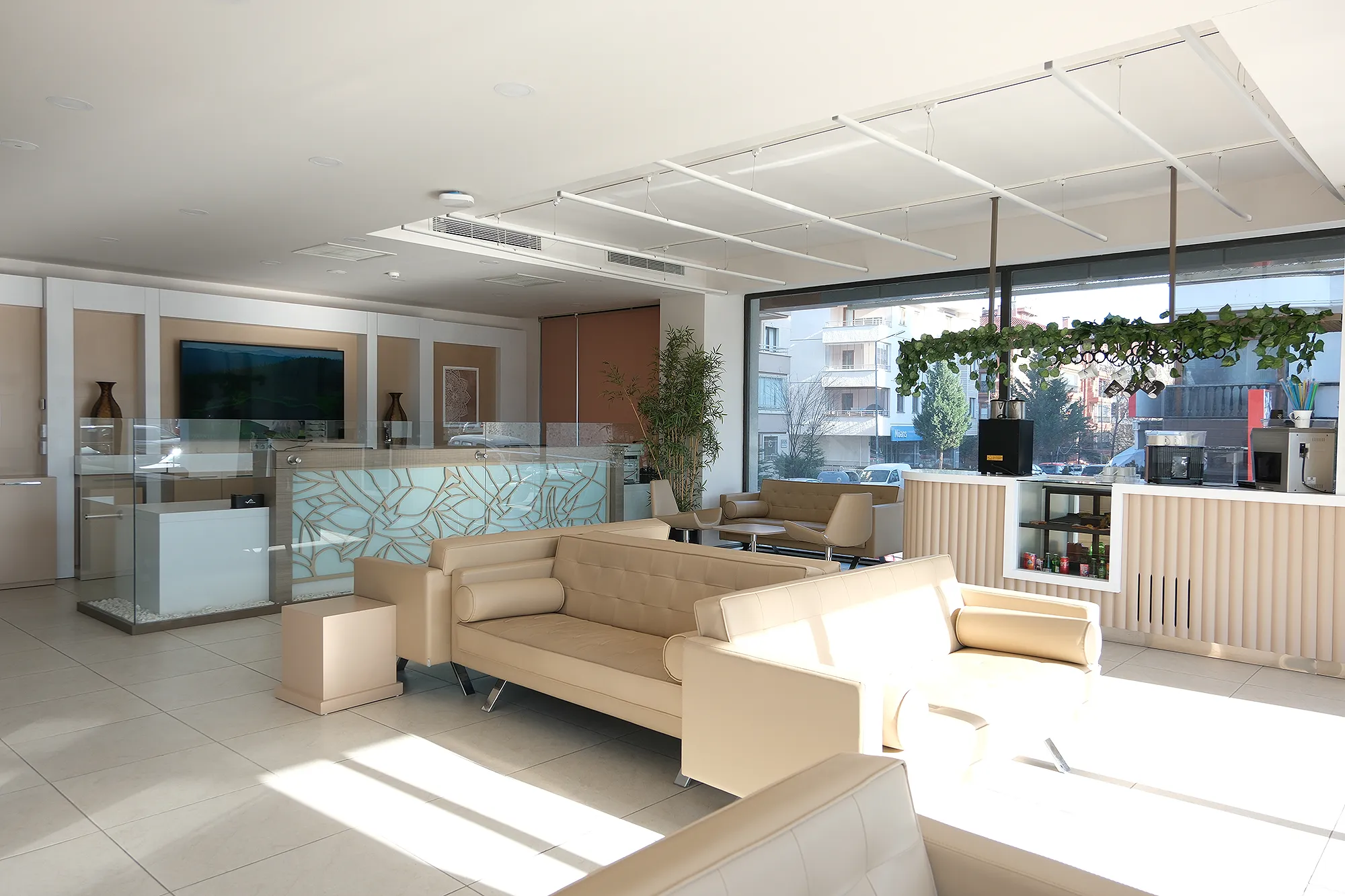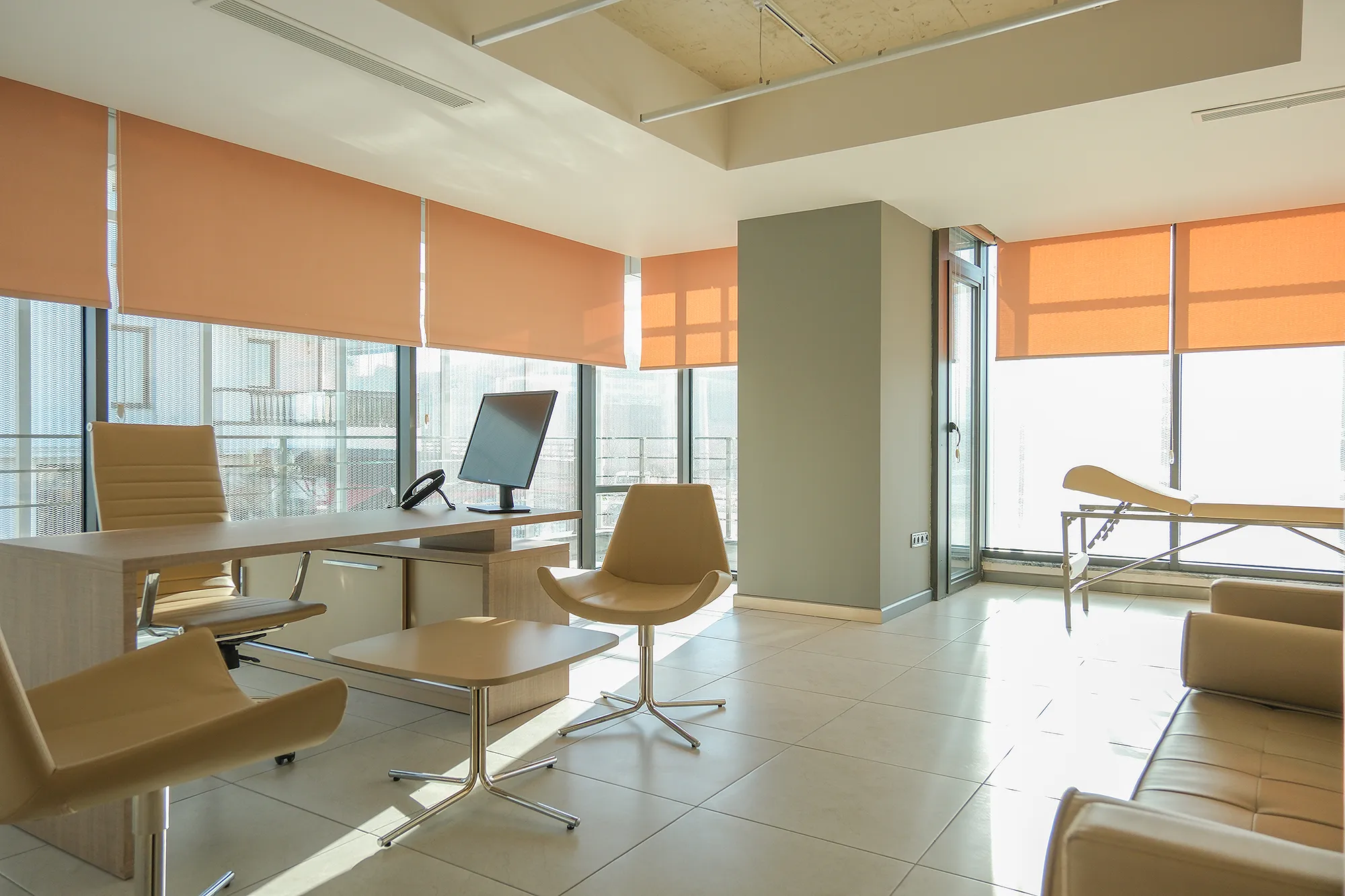 Lavabo, tuvalet, mobilya, çalışma masası, misafir kanepesi ve koltukları, sehpalar, IP telefon, muayene masası, 27" monitör gibi seçeneklere sahip konforlu muayenehaneler.